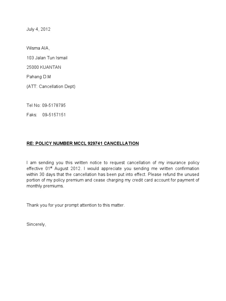 Cara pembatalan polisi insurans dan contoh surat. Contoh surat pembatalan insuranstakafulsurat rasmi cancel sila kunjungi kaunter khidmat pelanggan syarikat insurans anda untuk bertanya. Saya ingin membatalkan polisi saya atas.