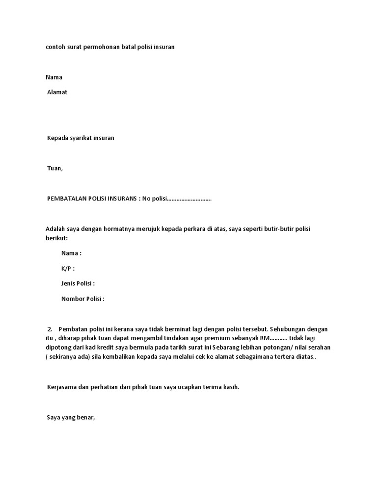CONTOH SURAT PERMOHONAN UNTUK MEMBATALKAN POLISI INSURANS PDF. Anda perlu mengambil kira beberapa perkara sebelum membatalkan polisi. Polisi insurans atau perlindungan takaful yang telah.